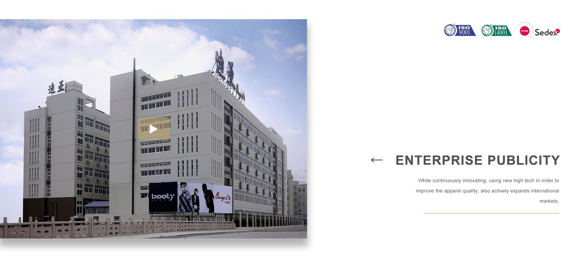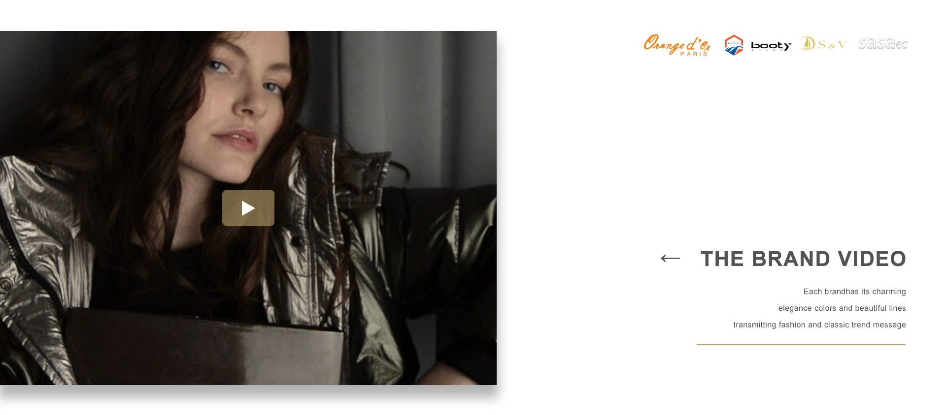 品牌建設(shè)是公司堅持不懈的追求,我們每年都會積極參加國內(nèi)外舉辦的各大服裝展銷會。憑借著良好的質(zhì)量與信譽(yù),市場占有率在逐漸擴(kuò)大,產(chǎn)品遠(yuǎn)銷歐洲、美洲、亞洲等國。公司以生產(chǎn)棉衣、羽絨服、派克、大衣、夾克、運動休閑服飾等為主,旗下主打品牌有 ORANGE D’OR 、CLAIRVAL、BOOTY JEANS 、S&V和SASAEC,各品牌服飾均以典雅的色彩、優(yōu)美的線條、卓越的魅力吸引著都市麗人,將時尚、經(jīng)典的潮流信息予以淋漓盡致的演繹。